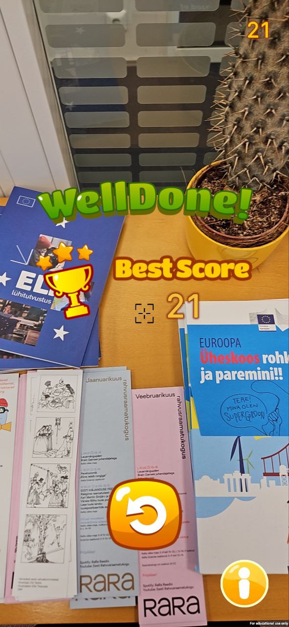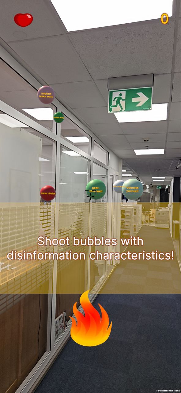 The player gains points by correctly and quickly interacting with the information bubbles (popping them - recognizing misinformation and/or propaganda signs, or saving them - recognizing trustworthy media signs and keywords). If a disinformation sign is left undestroyed, the player loses health.